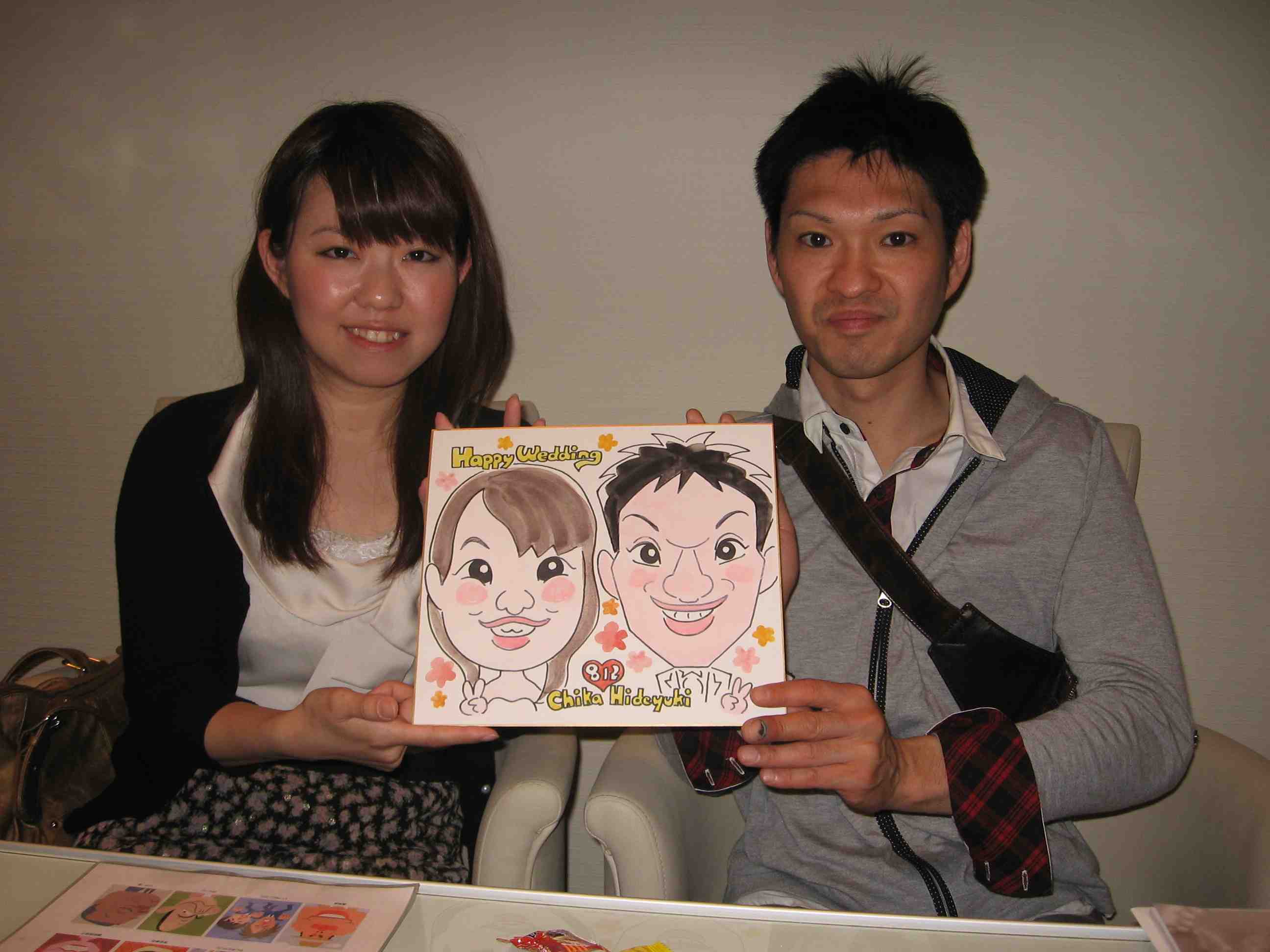 彼女はデザインをやっていて絵もお上手なのですが、似せるコツがわからないとのこと。ちょうどウェルカムボードが欲しいところだったみたいです 子供の日は最高の天気に恵まれました。いつものブライダルフェアでの似顔絵イベントです。今日の画像は1点のみ。時間が余裕あったのでウェルカムボードっぽい処理にしています。もう1枚、看護士同士のカップルもお描きしましたが、職場に公表してないということで顔出しNGでした。