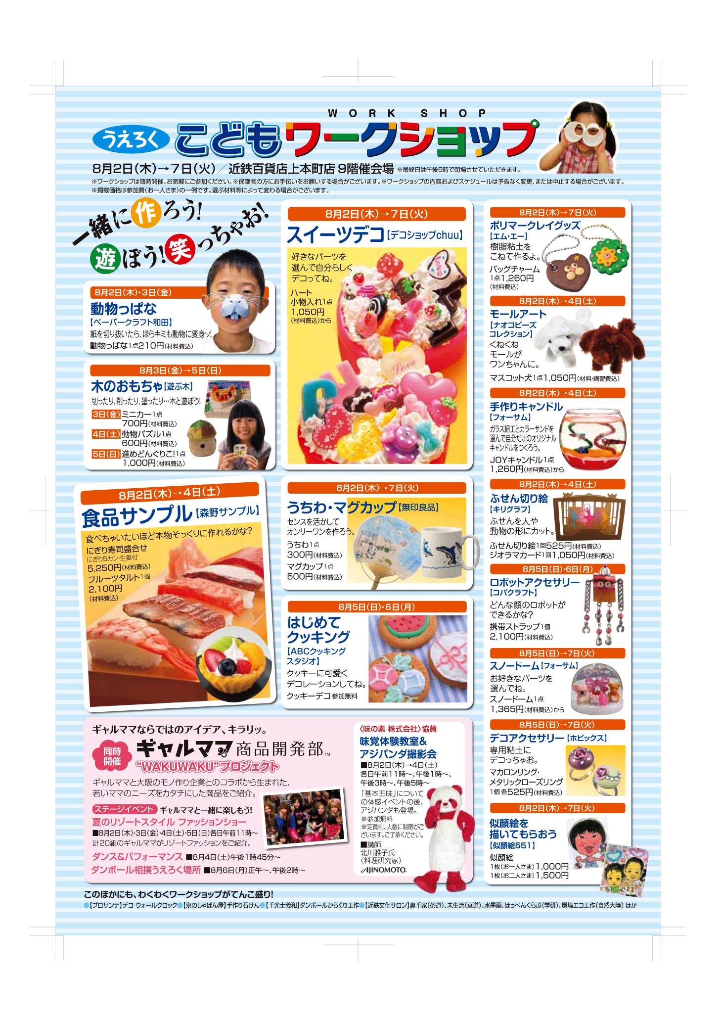 近鉄百貨店上本町店のこどもワークショップに出店します。期間:8/2(木)~7(火)9階イベント会場似顔絵1枚(お一人)1000円、(ペア)1500円いろんな手作りグッズのイベントや吉本芸人のショーもあります。