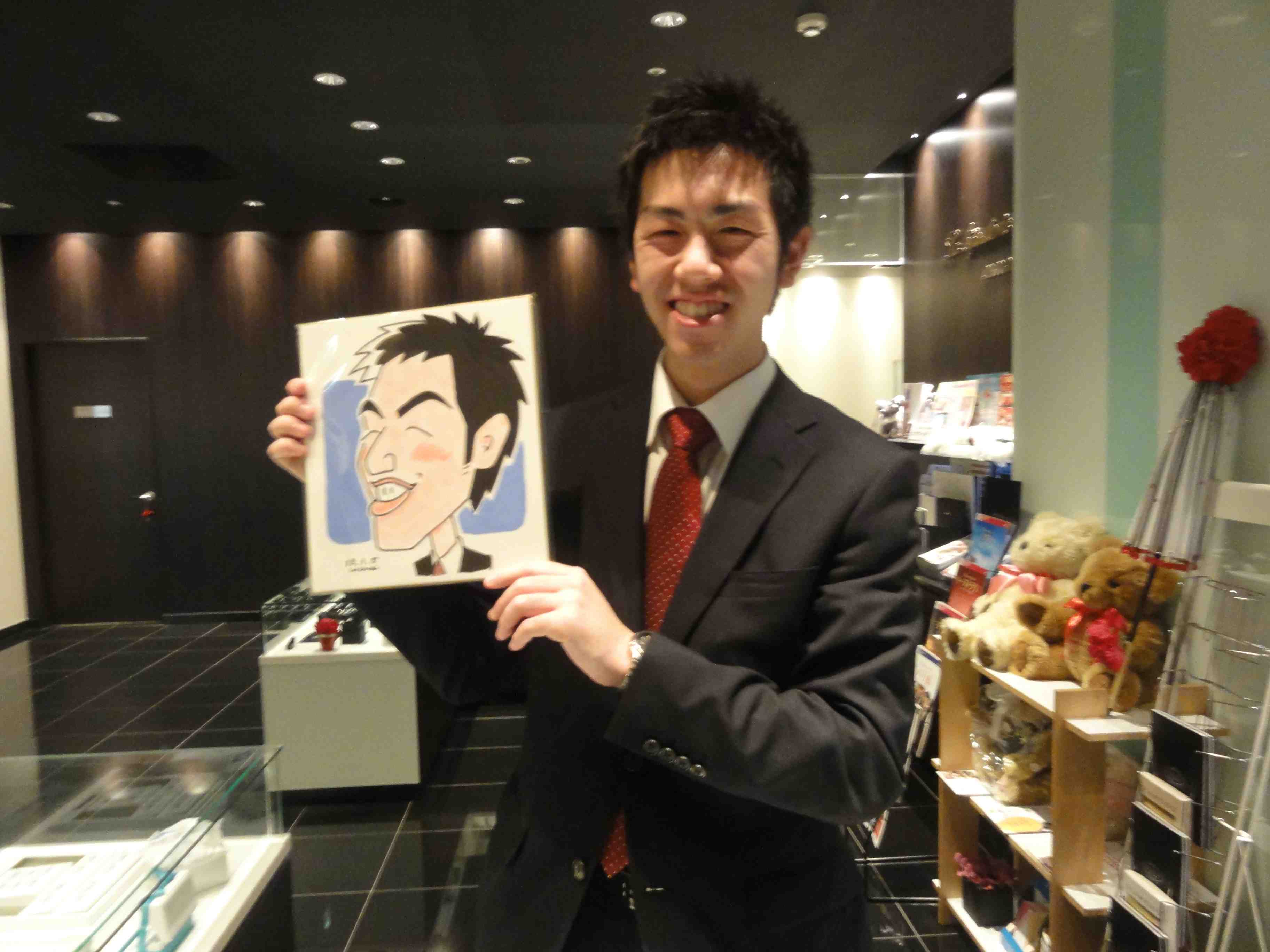 ジュエリーの業者さん。というか、まだ研修中の学生さんです 出張似顔絵は今日から始動。今年もたくさんの魅力的な「顔」との出会いを期待しています。
