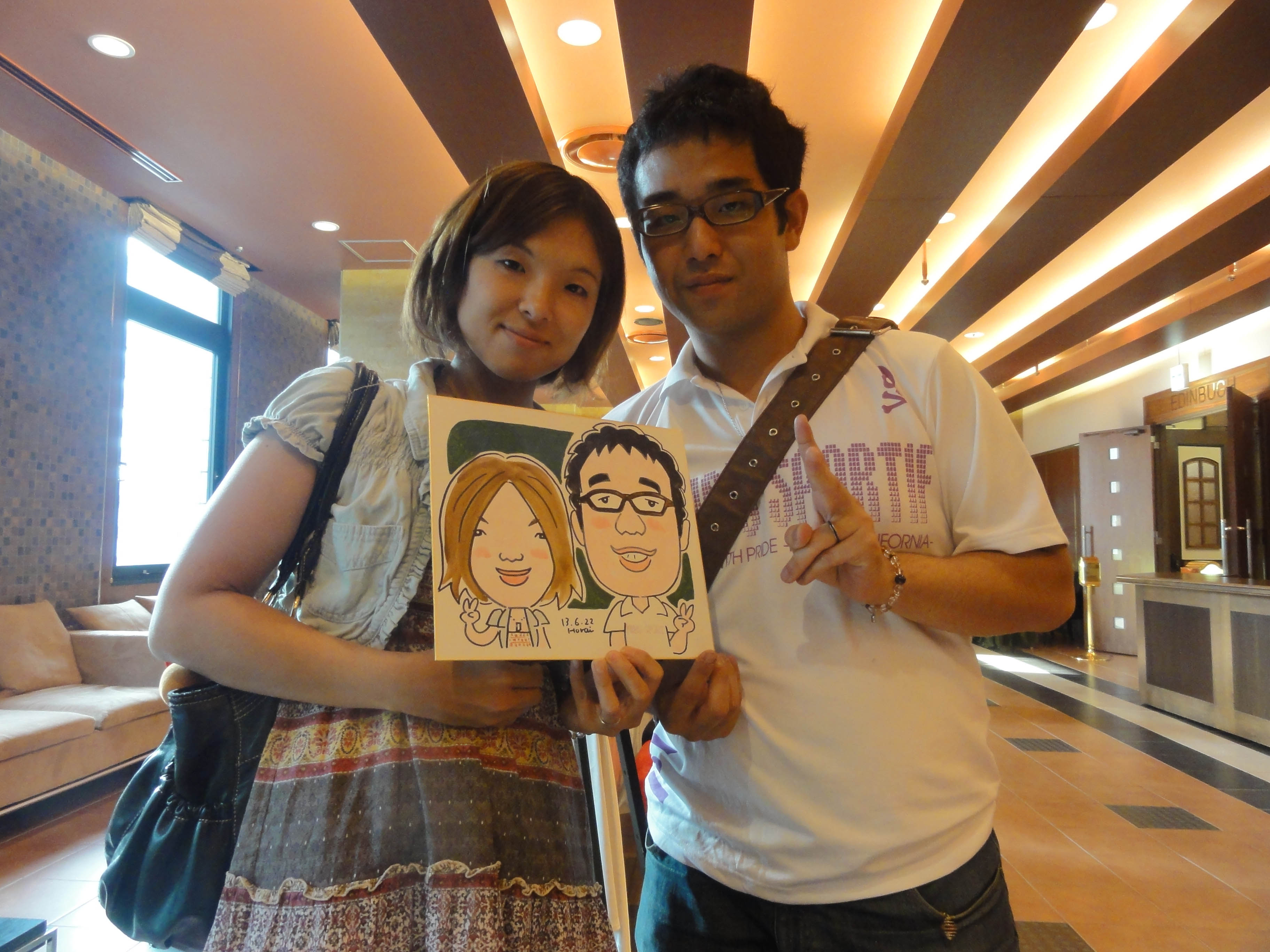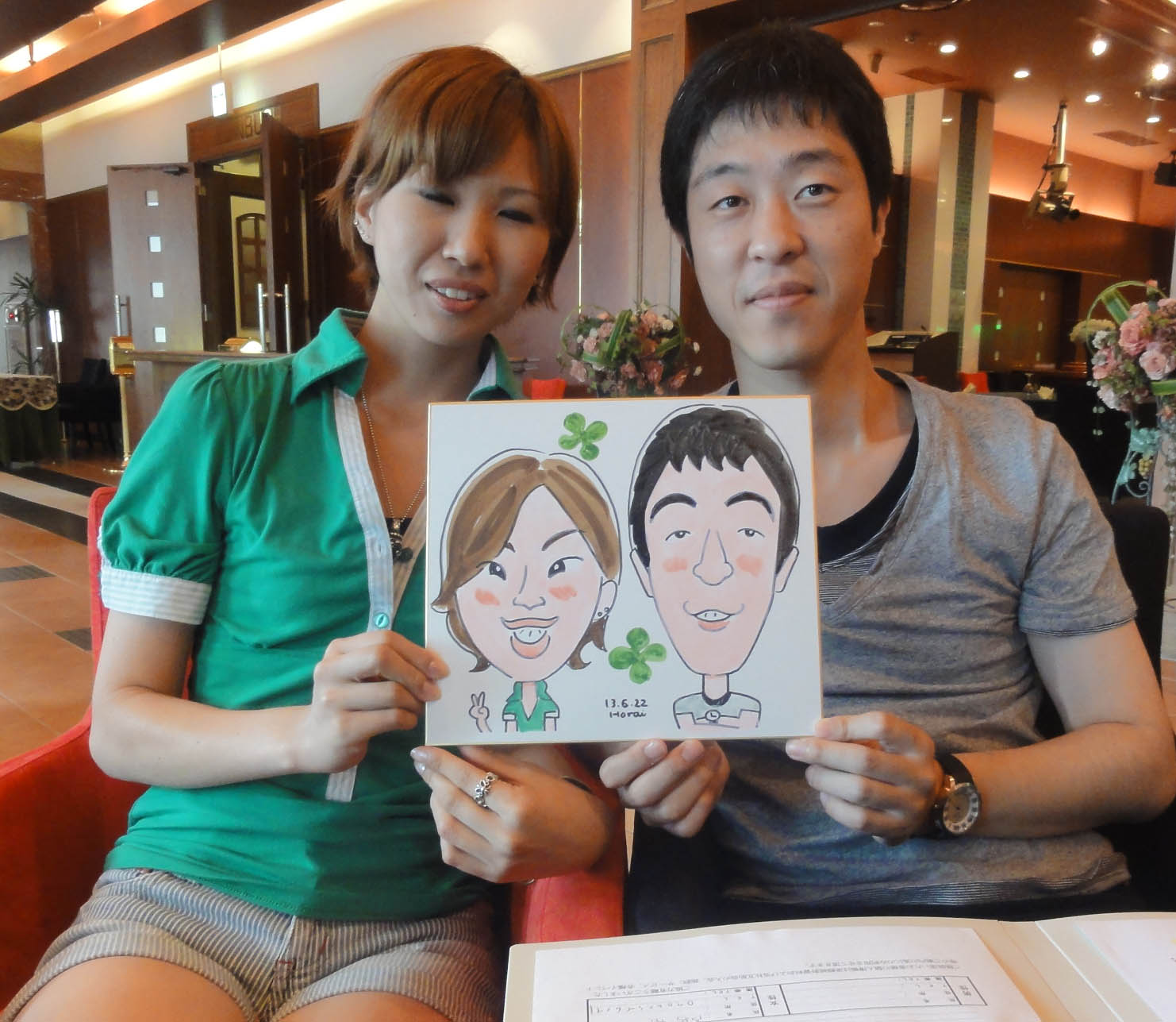 仲良しで初々しい感じのカップル 友人の披露宴会場(当会場)で出会ったというお二人 いつものブライダルフィアに出演しました。お客様が少なかったのは残念なのですが、そのうち1組から「似顔絵体験があったので来ました」と言われてちょっと嬉しかったです。