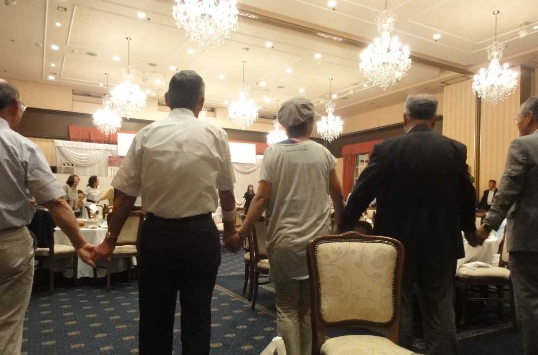 会の最後に手をつないで輪になる皆さん。ポン太さんも入っています 退院されたばかりという女性 着物姿の姉妹