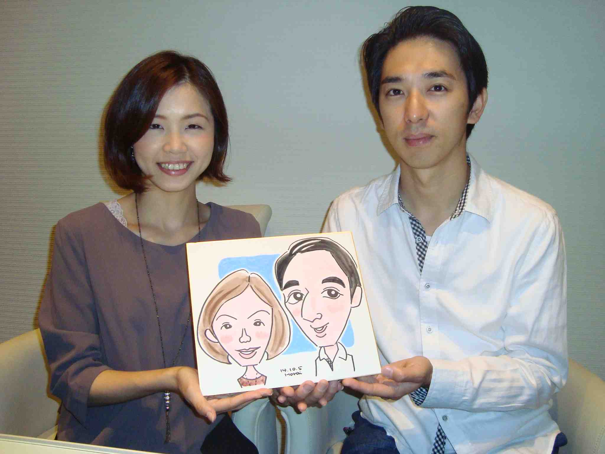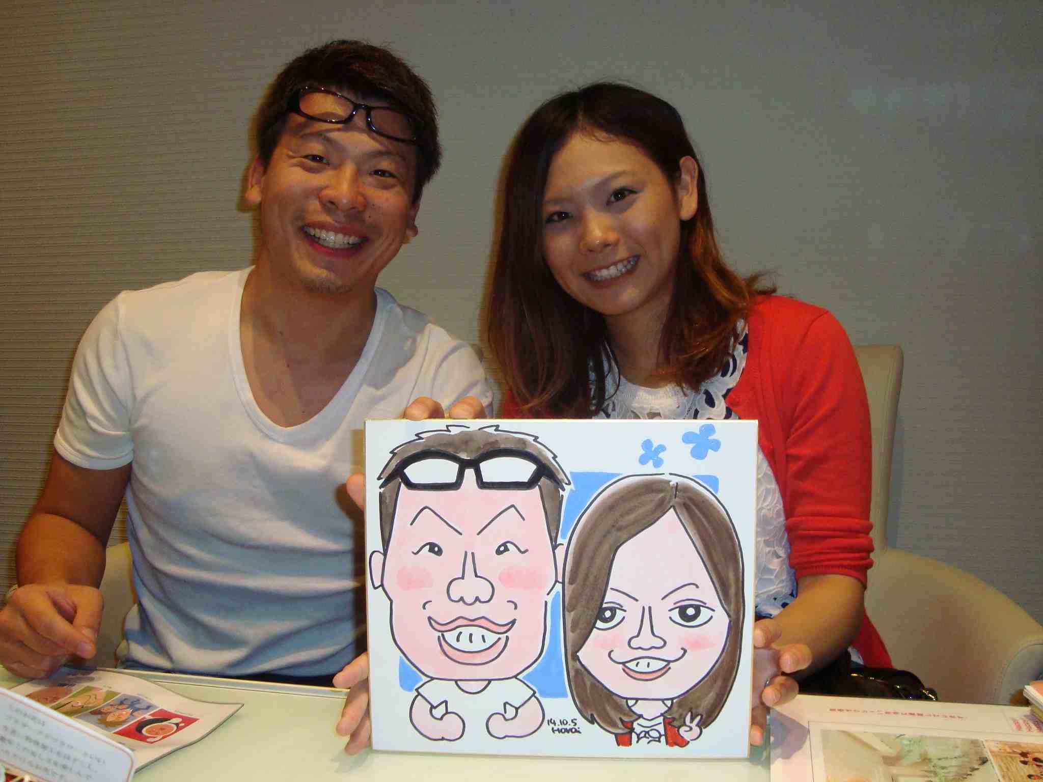 ご主人は料理が得意で一緒にキッチンに立って作っているそうです 似顔絵はとても描いて欲しかったそうでこちらも嬉しかったです グラン・アーモ タマヒメのプチフェアに出演しました。台風接近でお客様少ないかなと思いましたがいつもより多くの来場者でした。今日は3組のカップルを描くことができました。