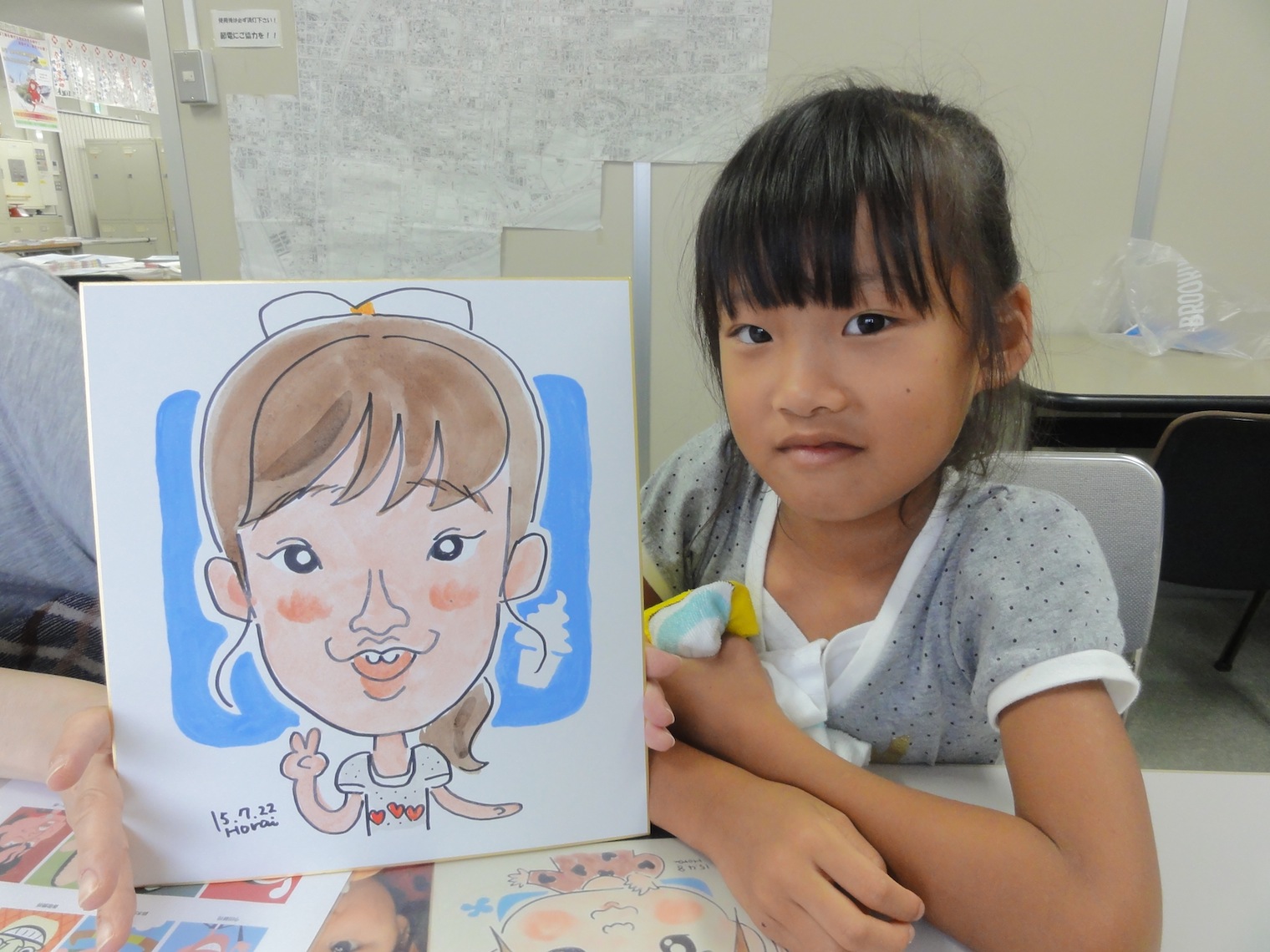 あまりぽっちゃりさせないでと言われつつもこの出来です。似顔絵とはしばしば辛辣なもの 熱がある中がんばってモデルになってくれました 日本生命あびこ営業部での似顔絵イベントに出演しました。梅雨明けですが一日雨模様でした。雨が結構強かったせいかお客様もキャンセルになったりでかなりゆったりした内容でした。