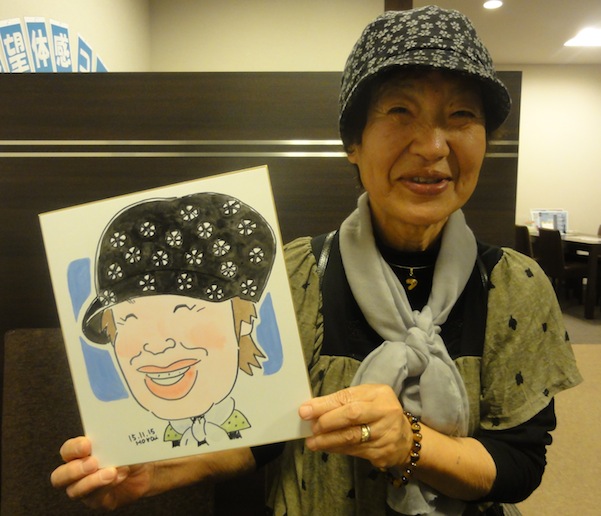 似顔絵コーナーです 終了間際に来場いただいた女性。健康のためにいろいろ積極的に出歩くそうです 昨日に引き続いての池田のマンションギャラリーです。天気は回復しましたがお客様の来場はなかなか伸びませんでした。ギャラリーから見て通りの向こうにある池田中央市場や、ダイエーなど、何か懐かしい雰囲気を感じました。