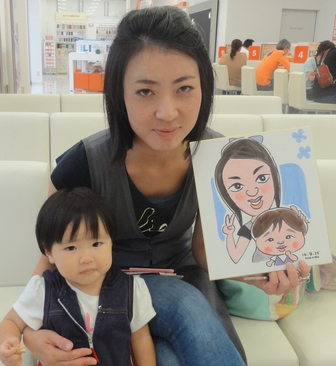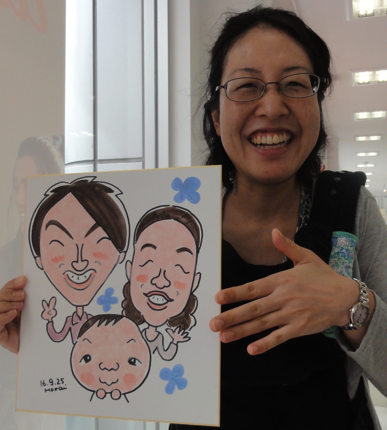 お子さんは寝ていたので、来られなかったご主人共々お写真から デフォルメタッチで描いてくださいとのことでしたが、全員崩せるわけではないのでわりと普通になってしまいました 西梅田店から助っ人で来られたスタッフ